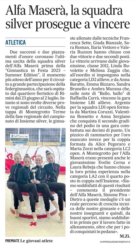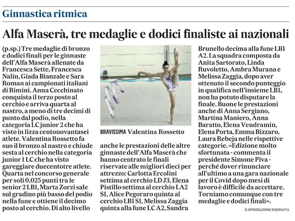 “Complimenti alle ginnaste e alle tecniche! – commenta Simone Piva, presidente dell’Alfa Maserà – Queste ragazze lavorano molto e il primo posto premia soprattutto il loro impegno. Questa medaglia d’oro si aggiunge a quelle vinte nei campionati federali individuali di marzo e non possiamo che essere orgogliosi dei nostri risultati”.