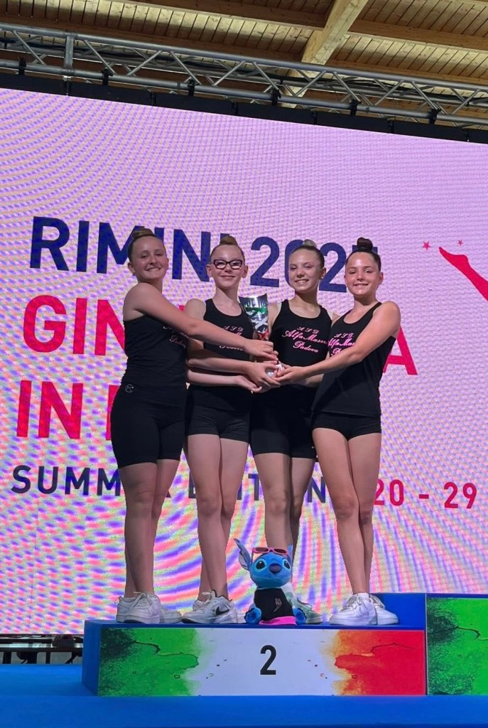 Infine, è la squadra composta da Anna Baratto, Emma Bizzaro, Sandra Brunello e Ambra Murana a regalare all’Alfa un’altra bellissima medaglia: il loro esercizio di squadra ai cerchi sulla musica di “Ballo ballo” di Raffaella Carrà merita il secondo posto Insieme LB1.