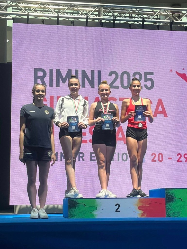 È stata poi la volta della categoria Junior 3 dove Carlotta Ercolini vince l’oro mentre Martina Maniero arriva in sesta posizione, su 29 ginnaste partecipanti, a pochi decimi dal podio.